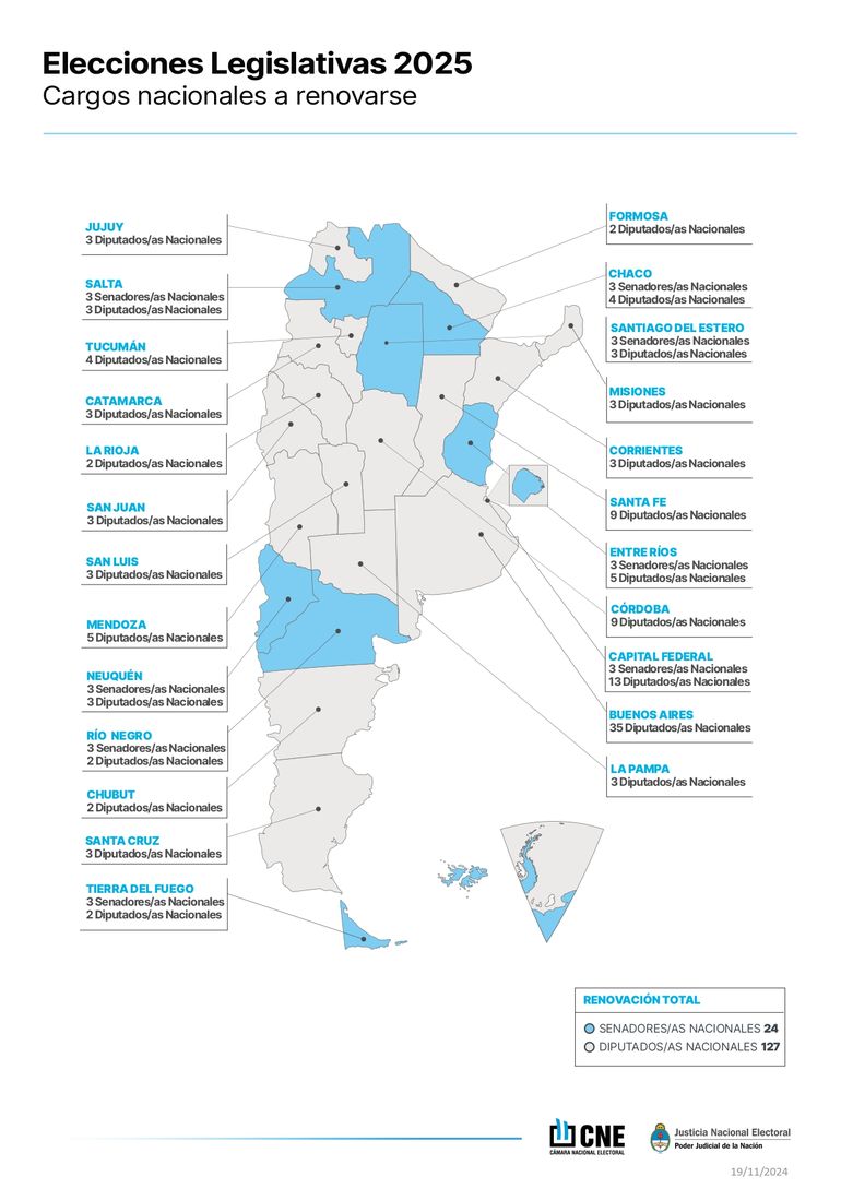 Diputados nacionales: se renuevan bancas en las 24 jurisdicciones del país (todas las provincias y la Ciudad Autónoma de Buenos Aires).