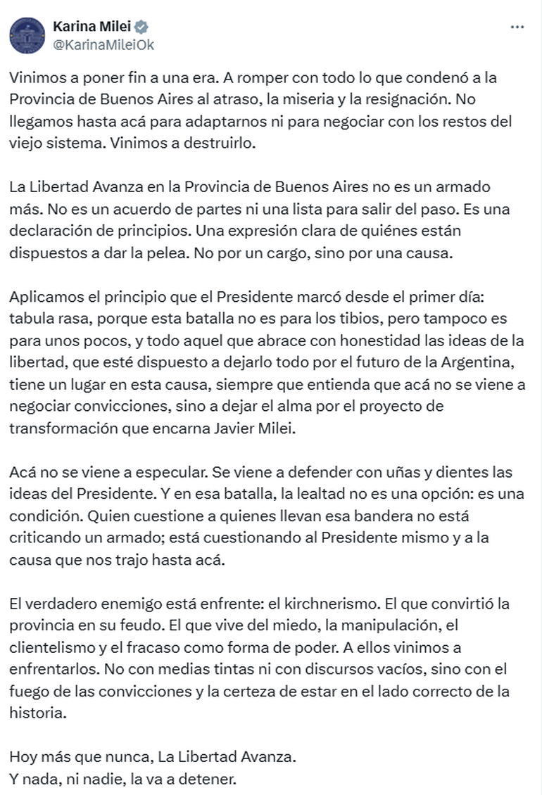 "Acá no se viene a especular. Se viene a defender con uñas y dientes las ideas del Presidente. Y en esa batalla, la lealtad no es una opción: es una condición. Quien cuestione a quienes llevan esa bandera no está criticando un armado, está cuestionando al Presidente mismo y a la causa que nos trajo hasta acá", escribió.