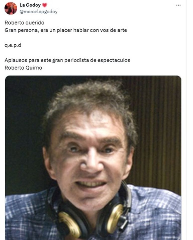 Una de las primeras en rendirle homenaje fue la locutora Marcela Godoy, quien a través de las redes sociales escribió: "Roberto querido, gran persona, era un placer hablar con vos de arte. Q.E.P.D. Aplausos para este gran periodista de espectáculos, Roberto Quirno".
