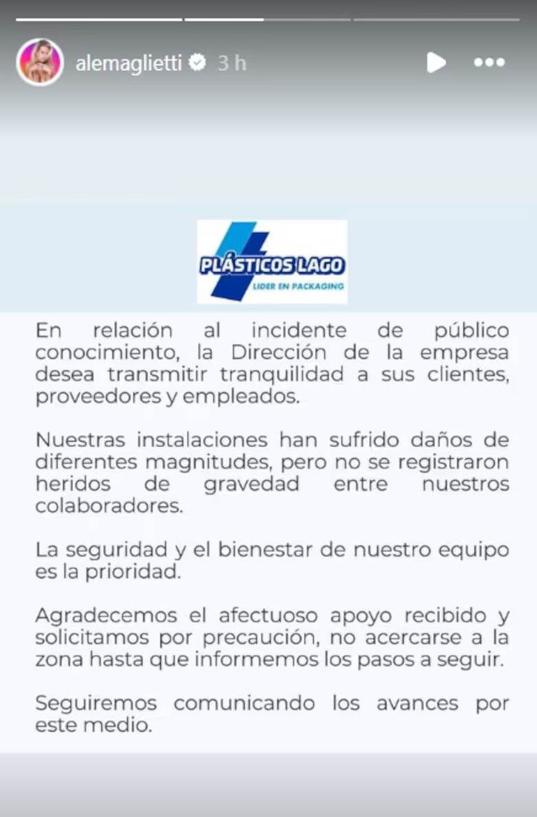 La empresa emitió un comunicado a través de Instagram: “En relación con el incidente de público conocimiento, la Dirección de la empresa desea transmitir tranquilidad a sus clientes, proveedores y empleados".
