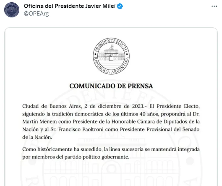 En coincidencia con el discurso de Milei, expresa la necesidad de "trabajar hacia un equilibrio político donde los ajustes sean asumidos por la clase política y no por la población" y afirma: "El nuevo gobierno va a demostrar su capacidad para mejorar las condiciones de vida de los ciudadanos, reducir la inflación y generar oportunidades económicas".