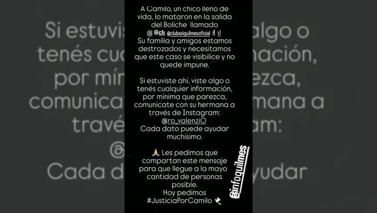 Mientras la justicia trabaja, las redes sociales se han llenado de mensajes de recuerdo y reclamos de justicia. La hermana de Camilo, en un emotivo posteo, pidió a posibles testigos que se acerquen a aportar información para que la muerte del joven "no quede impune".
