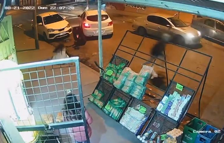 El violento robo ocurrió cerca de las 22 horas, frente a un kiosco ubicado en la calle Condarco al 4500, casi esquina Pedro León Gallo, en la localidad de San Justo. La impactante escena quedó registrada por una cámara de seguridad del local.