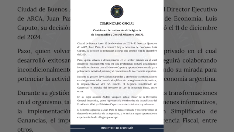 Se confirmó que renunció Juan Pazo como titular de ARCA. El licenciado Andrés Edgardo Vázquez asumirá como nuevo Director Ejecutivo de la Agencia de Recaudación y Control Aduanero (ARCA) a partir del próximo jueves, según se publicó hoy en el Boletín Oficial.
