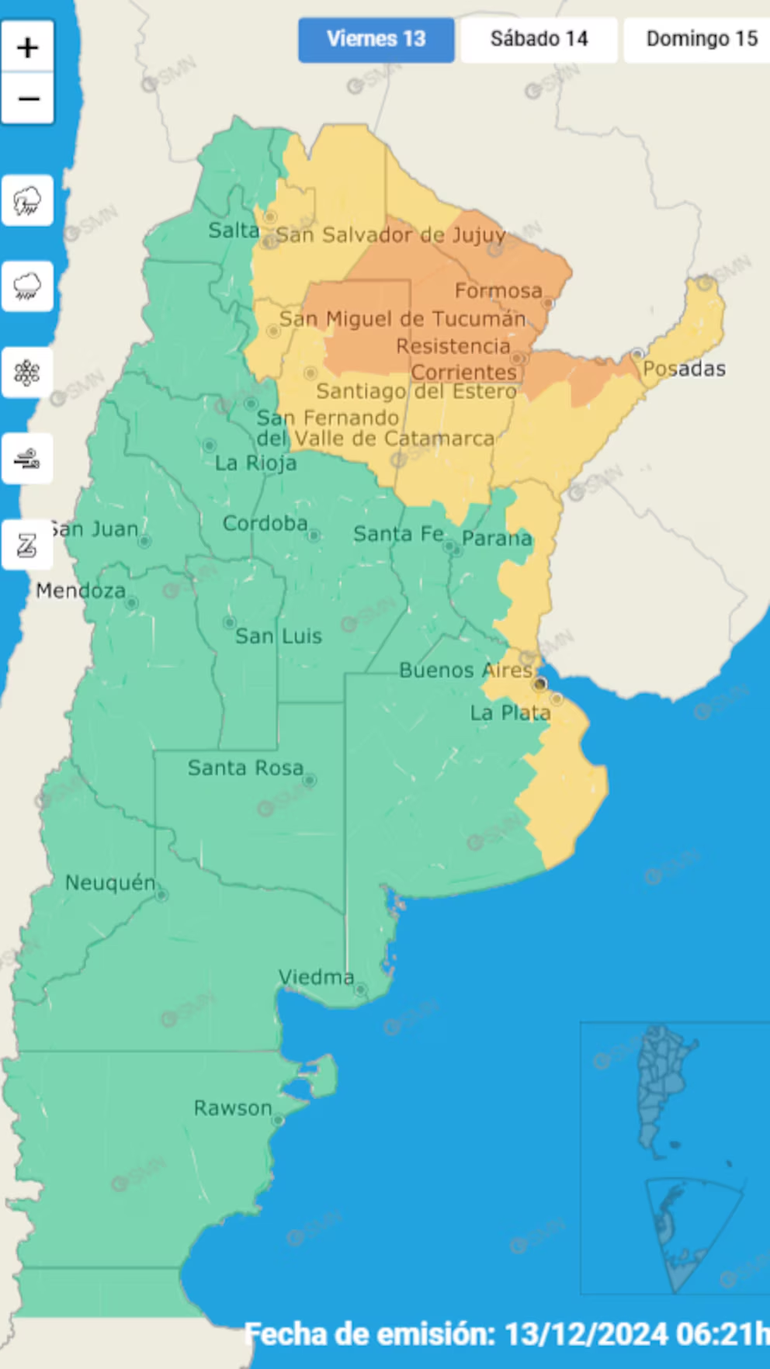 Las tormentas llegarán a Provincia de Buenos Aires, CABA, Jujuy, Salta, Tucumán, Santa Fe, Misiones y Entre Ríos, con un nivel de alerta amarillo. El SMN señala que el fenómeno podrá estar acompañado por “abundante caída de agua en cortos periodos, frecuente actividad eléctrica, fuertes ráfagas, y ocasional caída de granizo”. Los valores de precipitación acumulada previstos son entre 20 y 50 milímetros, según la zona y con la posibilidad de ser superados.