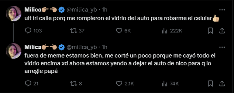 Horas después del incidente, Milica recurrió a sus redes sociales para tranquilizar a sus seguidores. En un mensaje breve, aseguró que se encontraba físicamente ilesa, aunque visiblemente afectada por lo ocurrido. "Ult irl calle porque me rompieron el vidrio del auto para robarme el celular", escribió en X.