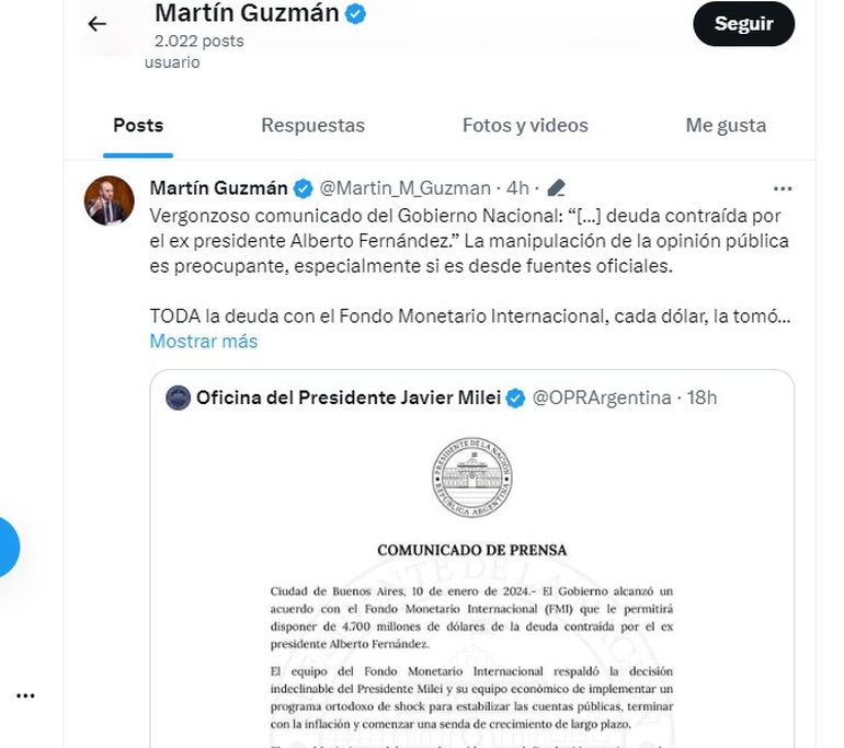 Tras el acuerdo para fijar nuevas metas con el FMI, el exministro de Economía durante gran parte de la gestión anterior Martín Guzmán se sumó a una ola de críticas que saltó cuando desde la cuenta de la Oficina del Presidente Javier Milei se indicó que la deuda fue contraída por el por el ex presidente Alberto Fernández.