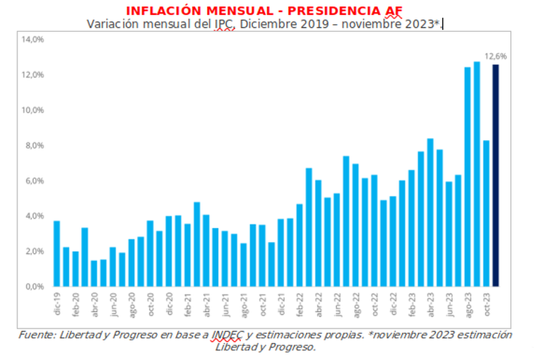 Por su lado, la Fundación Libertad y Progreso estimó un aumento de 12,6% mensual. Con esta variación, el IPC consolida la aceleración que se vio en las últimas semanas de octubre y regresa a los aumentos que se registraron tras el salto cambiario post PASO.