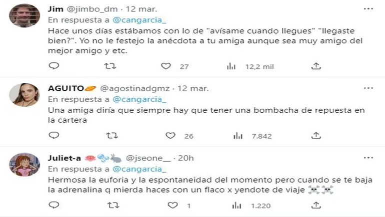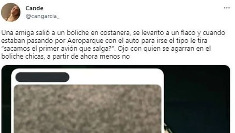 “Una amiga salió a un boliche en Costanera, se levantó a un flaco y cuando estaban pasando por Aeroparque con el auto para irse el tipo le tira: ´¿Sacamos el primer avión que salga?´ Ojo con quien se agarran en el boliche, chicas, a partir de ahora menos no”, relató la usuaria @cangarcia_.