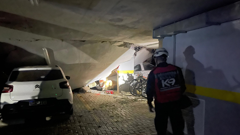 La Guardia de Auxilio también fue convocada para evaluar las condiciones estructurales del edificio y determinar su estado general. En paralelo, se procedió a cortar la energía de los vehículos que habían quedado con las alarmas activadas tras el derrumbe.