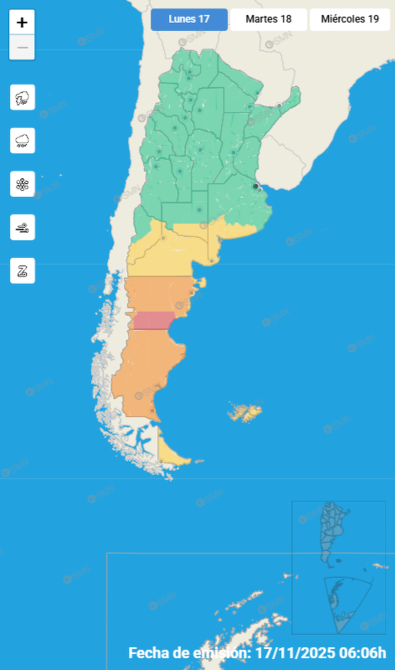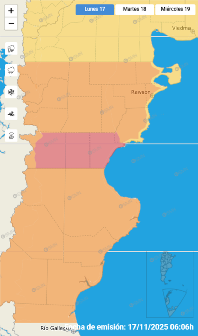 El aviso del Servicio Meteorológico Nacional, que implica que la población debe "prepararse", se extiende también a otras provincias patagónicas como el caso de Chubut, donde la alerta se eleva a naranja y roja en algunos sectores.