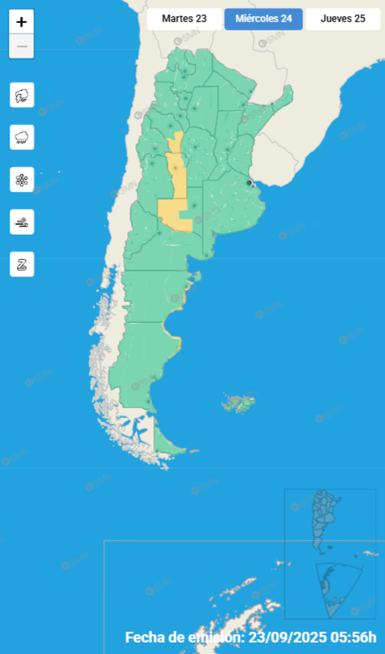 Asimismo, el Servicio Meteorológico Nacional (SMN) ya emitió una alerta de nivel amarillo por vientos fuertes. Según se precisó, alcanzará a las provincias de La Rioja, San Luis, sierras de Córdoba, La Pampa, oeste de Buenos Aires y gran parte del sector costero de la Patagonia, entre el miércoles y jueves.