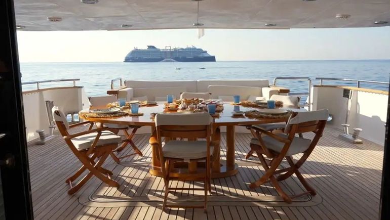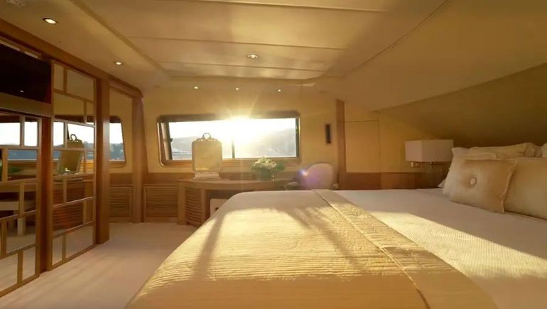 Con capacidad para diez huéspedes distribuidos en cinco camarotes —incluida una suite principal con vestidor, baño en suite y escritorio—, el barco funcionaba con una tripulación de ocho personas. El servicio estaba orientado al lujo total: salones amplios, comedor formal, bar exterior, terrazas con vista al mar y un solárium con Wi-Fi, televisión satelital y consola de videojuegos.