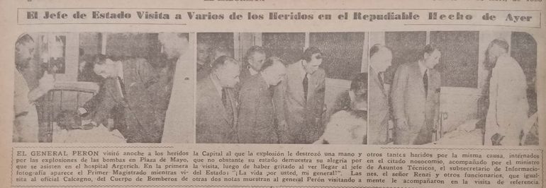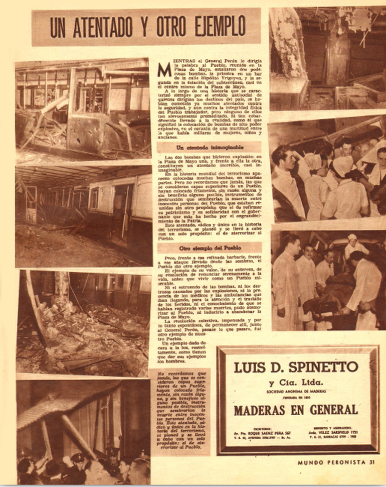 Perón retomó el discurso: “Compañeros: estos, los mismos que hacen circular los rumores todos los días, parece que hoy se han sentido más rumorosos, queriéndonos colocar una bomba...”. En ese instante se escuchó otro estallido, mucho más potente que el anterior: era la bomba colocada en la estación Plaza de Mayo, de cuyas bocas de acceso comenzó a emanar humo.