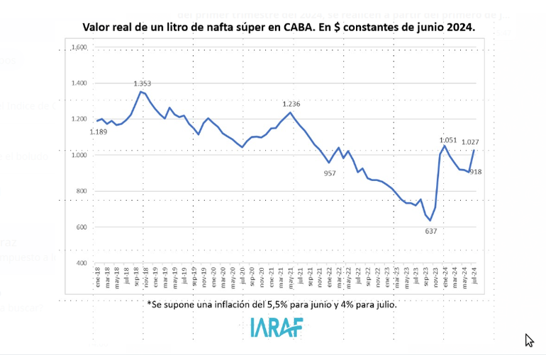 Argañaraz sostiene que “considerando el valor al día de hoy de un litro de nafta súper, esta actualización del tributo de julio, bajo el supuesto de traslado pleno, implicaría pasar de un valor de $1.046 a $1.209 en la ciudad de Córdoba, es decir, un incremento del 15,6%. En CABA pasaría de $905 a $1068, aumentando un 18%”.