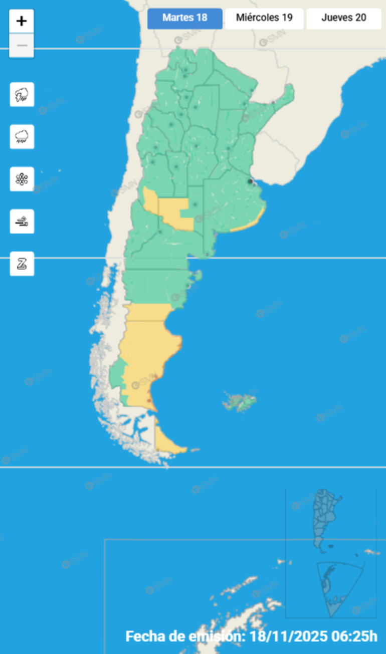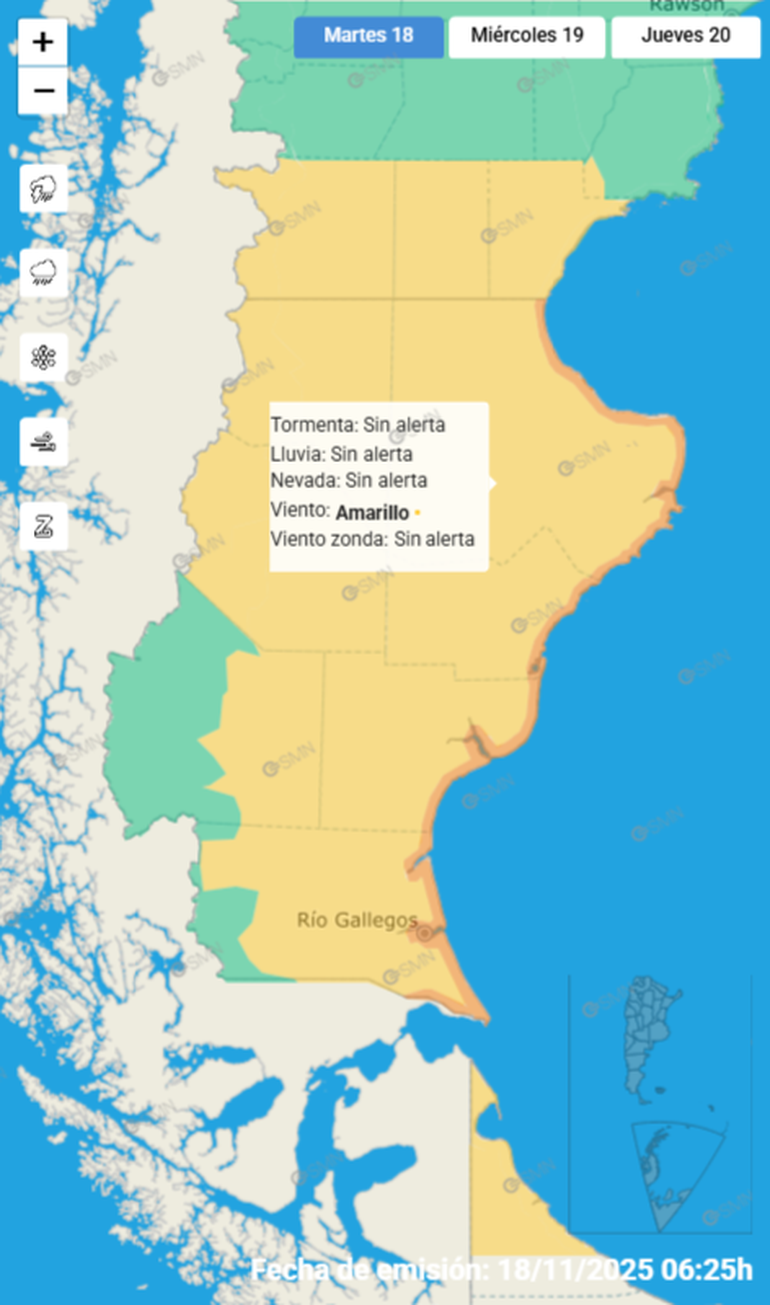 Asimismo rige la alerta amarilla por lluvia en algunas zonas de Santa Cruz y Tierra del Fuego. Según el SMN, el área será afectada por precipitaciones persistentes de intensidades variables, algunas localmente fuertes. Los valores acumulados se estiman entre 10 y 20 milímetros, aunque podrían superarse de forma puntual.