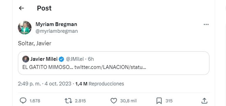 La respuesta de Bregman no se hizo esperar y le respondió a Milei en la misma red social: "Soltar, Javier".
