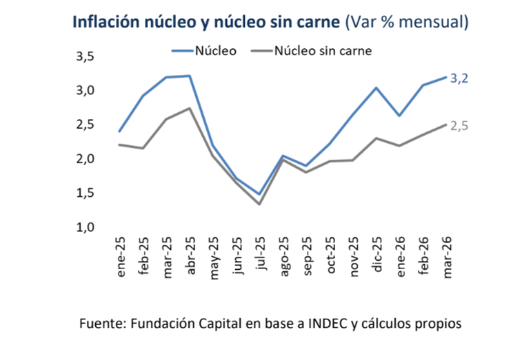El trabajo señala que "abril marcaría un punto de inflexión ya que se estima una suba del 2,7% mensual, con una núcleo en torno al 2,6%, ya sin ajustes relevantes en el precio de la carne".