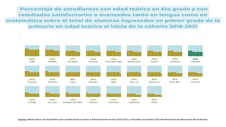 En consecuencia, en todo el país, el 57% de los alumnos comienza la secundaria sin haber adquirido los aprendizajes básicos necesarios. Esto lleva a que solo 16 de cada 100 alumnos argentinos terminen la escuela secundaria en tiempo y forma, es decir, con la edad y los conocimientos esperados.