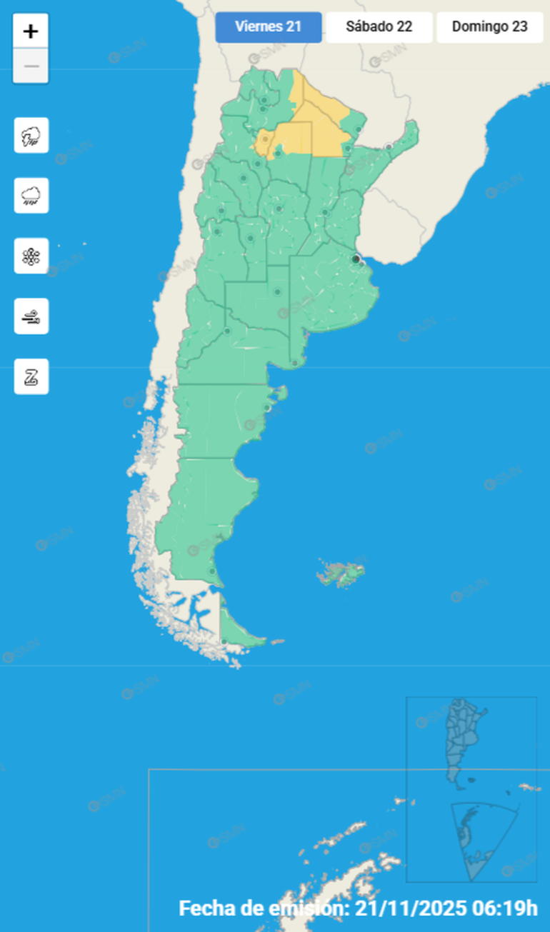 El Servicio Meteorológico Nacional (SMN) emitió una seria de alertas de nivel amarillo para este viernes 21 de noviembre, por tormentas, lluvias intensas y vientos fuertes en distintas provincias.