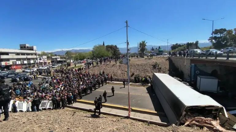 El transporte de cargas sufrió un impresionante vuelco en Guaymallén, Mendoza. Hubo incidentes con la Policía, que intentó evitar el robo.
