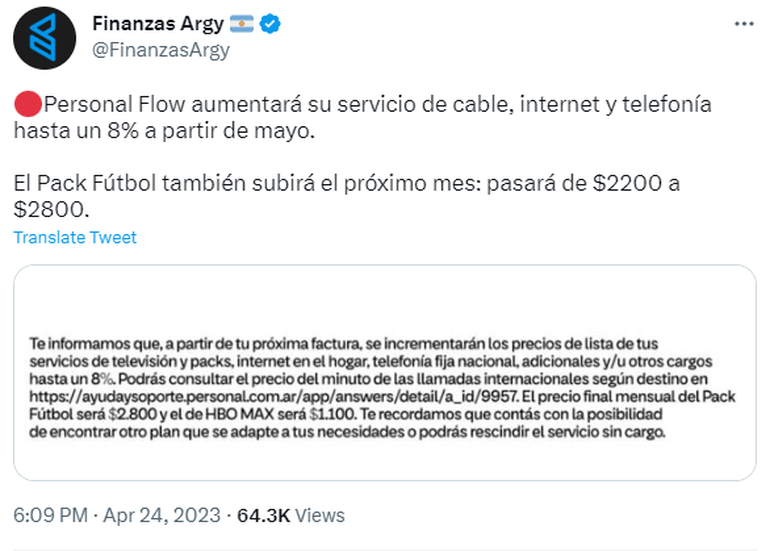 Las diferentes compañías de cable empezaron a difundir la decisión mediante diversas vías de comunicación. Personal comunicó con claridad: "Te informamos que, a partir de tu próxima factura, se incrementarán los precios de lista de tus servicios de televisión y packs, internet del hogar, telefonía fija nacional, adicionales y/u otros cargos hasta un 8%. El precio final mensual del Pack Fútbol será $2.800 y el de HBO MAX de $1.100".
