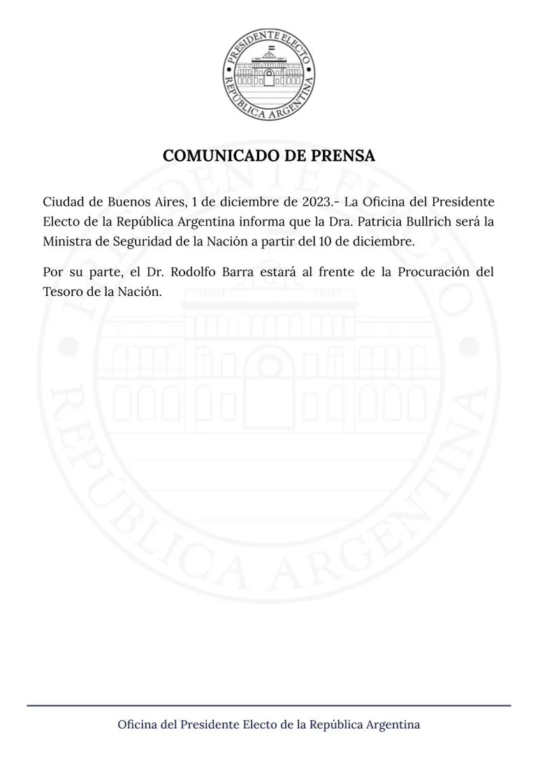 El cargo fue anunciado a través de las redes sociales de la oficina del presidente electo, el organismo oficial de comunicación de Javier Milei.