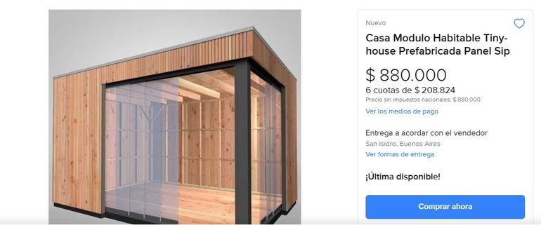 Son un estilo de casa compacta que tienen una dimensión de entre 20 m2 y 50 m2. Se puede conseguir en Mercado Libre por $880.000 y se puede pagar hasta en 12 cuotas, según un relevamiento de Ámbito.