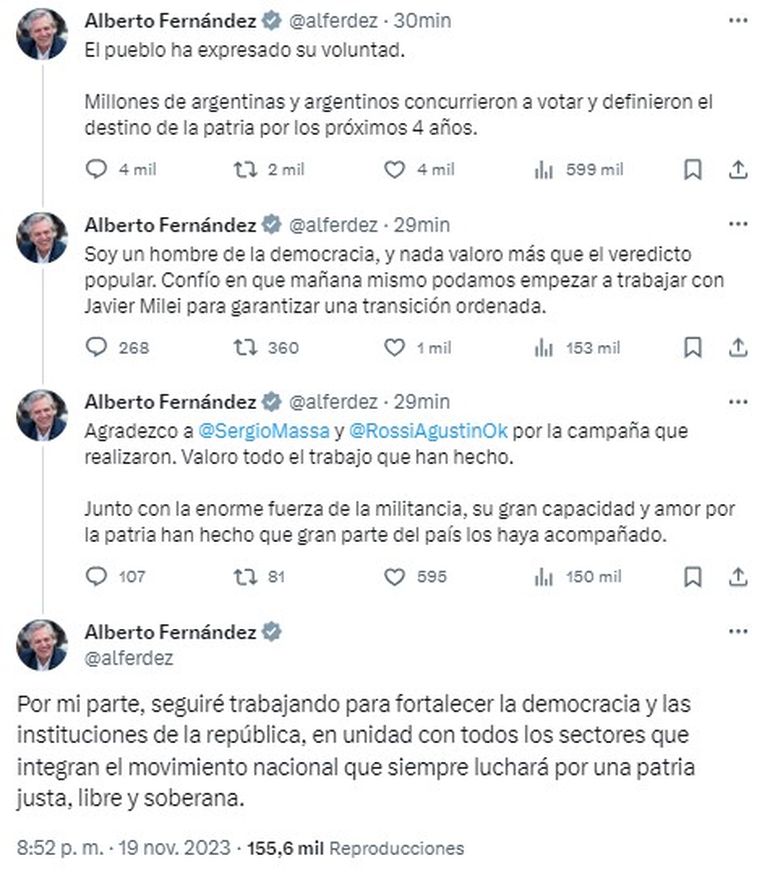 Apenas finalizó el discurso de Sergio Massa, en el que confirmó que Javier Milei se había transformado en el nuevo Presidente de Argentina, empezaron a llover las felicitaciones y los saludos en las redes sociales para el libertario.