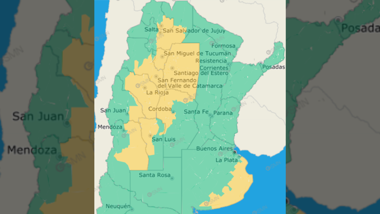 Las zonas advertidas por fuertes tormentas serán casi la totalidad de la costa bonaerense, una porción de Jujuy y Salta; la totalidad de Santiago del Estero y Tucumán; el este de Catamarca; casi la totalidad de La Rioja; el noroeste de Córdoba; el noroeste de San Luis, el sureste de San Juan y una porción mayoritaria de Mendoza.