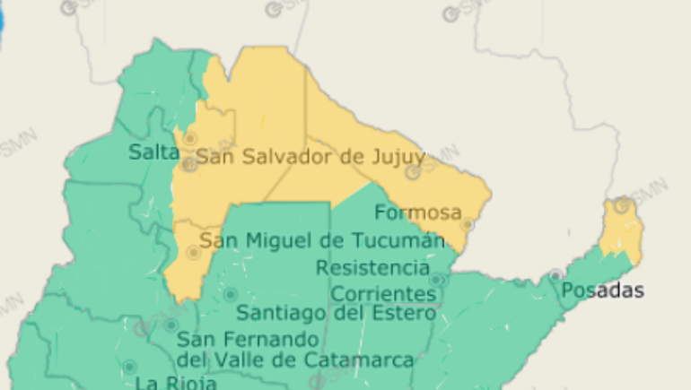 Para el viernes, el SMN anticipó que el extremo norte del país será azotado por fuertes tormentas, por lo que emitió una alerta amarilla. Las zonas afectadas serán el este de Jujuy, la mitad este de Salta, casi la totalidad de Tucumán, todo el territorio de Formosa, una porción de Chaco y la frontera norte de Misiones.