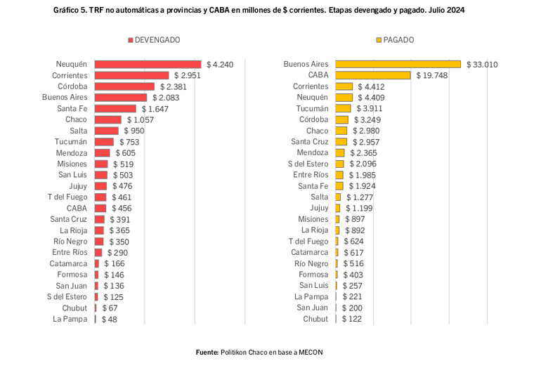 "Los valores finales de las transferencias no automáticas marcaron un hito durante julio, aunque por características distintas: vistas por volumen de pesos corrientes, las devengadas fueron las más bajas de lo que va del año; por el contrario, las pagadas fueron las más altas del 2024", explicó Politikon Chaco..