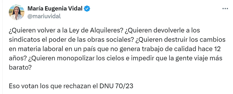 En tanto, el diputado nacional del PRO Damián Arabia indicó: “16 años de destrucción sistemática de las instituciones y el robo más grande del país, y nunca el senado había rechazado un DNU”. “Votaron contra los que producen, contra los que trabajan, contra los que alquilan y los inquilinos. Háganse cargo de que votaron con el kirchnerismo”, fustigó el dirigente cercano a Patricia Bullrich.