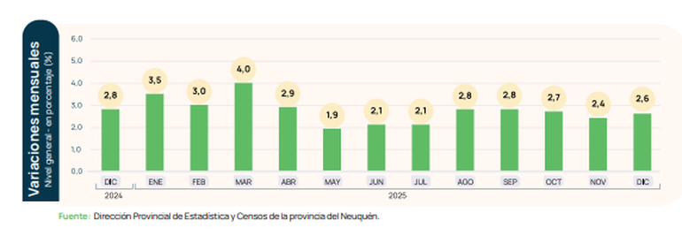 Según el reporte oficial de Estadísticas y Censos de la Provincia, la inflación de diciembre fue impulsada por las divisiones: Transporte (5,5%), Alimentos y bebidas no alcohólicas (3,2%) y Vivienda, agua, electricidad y otros combustibles (2,8%).