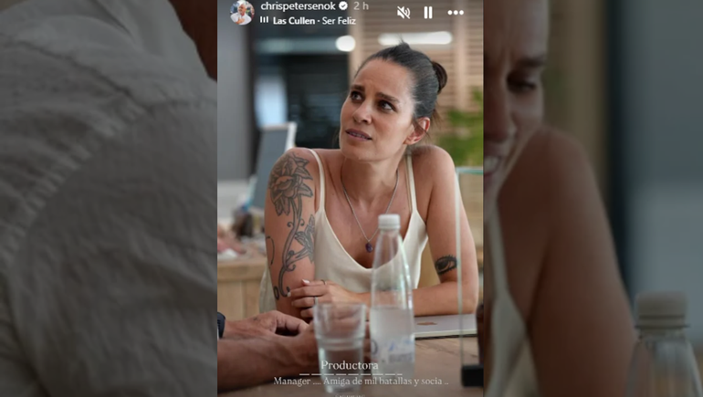 En la imagen, ambos aparecen concentrados, observando algo fuera de plano. Petersen luce una camisa blanca con las mangas arremangadas, mientras Martins sonríe vestida con una musculosa blanca.