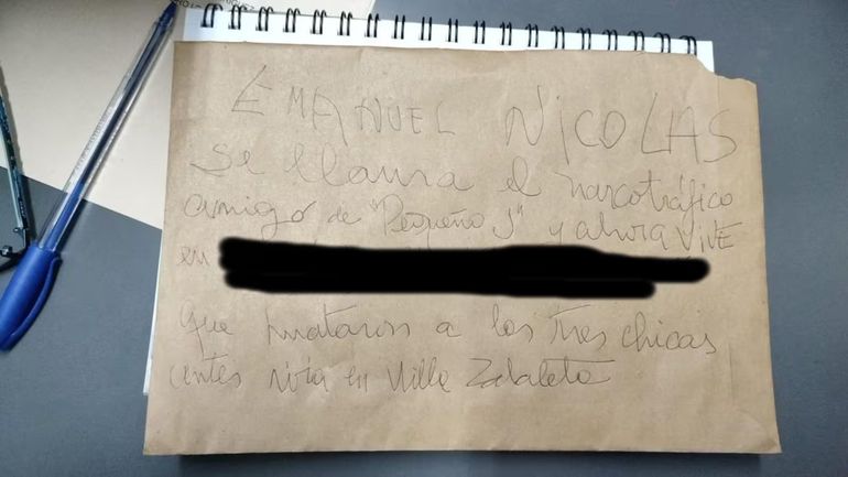 "Emanuel Nicolás se llama el narcotráfico amigo de 'Pequeño J'", indicó la carta escrita en un papel de madera con lápiz. Quien la escribió, dejó la dirección en la que presuntamente viviría actualmente Nicolás, quien hoy es el principal acusado por el triple crimen.