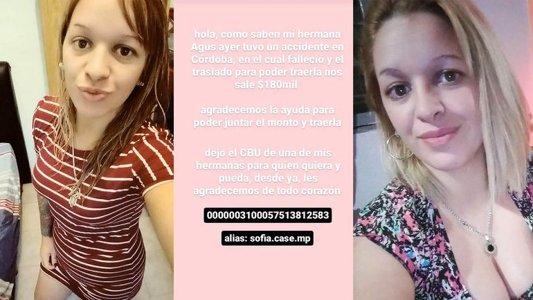 “Como saben mi hermana Agus ayer tuvo un accidente en Córdoba en el cual falleció. Para poder trasladarla necesitamos $ 180 mil. Agradecemos la ayuda para juntar el monto. Dejo el CBU de una de mis hermanas para quien quiera y pueda, desde ya, les agradecemos de todo corazón: 0000003100057513812583”, escribió en un posteo que, de a poco, comenzó a ser compartido.