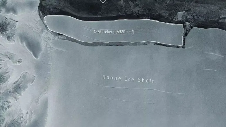 El iceberg A-76 se desunió del lado occidental de la plataforma de hielo de Ronne, al noroeste de la Antártida, y ahora está flotando en el mar de Weddell, según informó la Agencia Espacial Europea. La magnitud del bloque fue alarmante: tenía 170 kilómetros de largo y 25 kilómetros de ancho, lo que lo hacía más grande que Long Island, en Nueva York, y la mitad del tamaño de Puerto Rico.