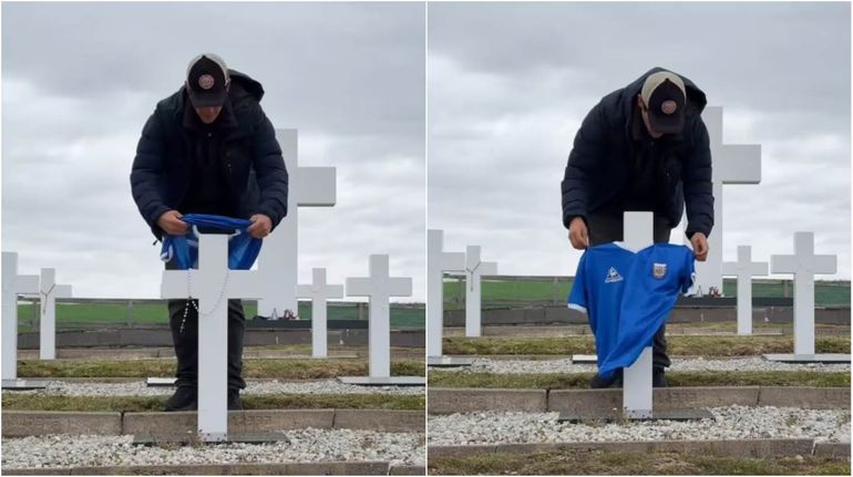 El momento más emotivo del viaje fue cuando llegó al cementerio de Darwin, donde descansan los soldados argentinos caídos en combate. Juan llevó con él dos camisetas de la selección argentina del Mundial de 1986, el torneo que marcó la revancha simbólica contra Inglaterra con los goles de Maradona.