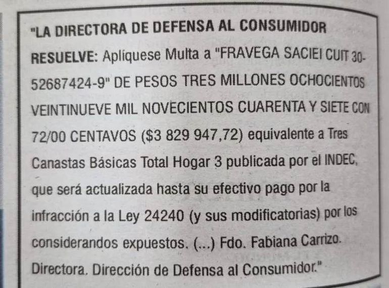 Luego de evaluar el caso y de que no se llegara a un acuerdo en las audiencias de conciliación, el organismo dispuso imponer a Frávega una multa de $3.829.947,72, según consta en la resolución que lleva la firma de Fabiana Carrizo.