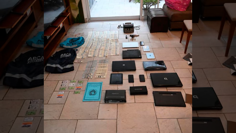 Además, se incautaron 30 millones de pesos en efectivo, 20.000 dólares estadounidenses y 1.300 dólares presuntamente falsos, junto a una arma de fuego calibre 9 mm sin documentación respaldatoria.