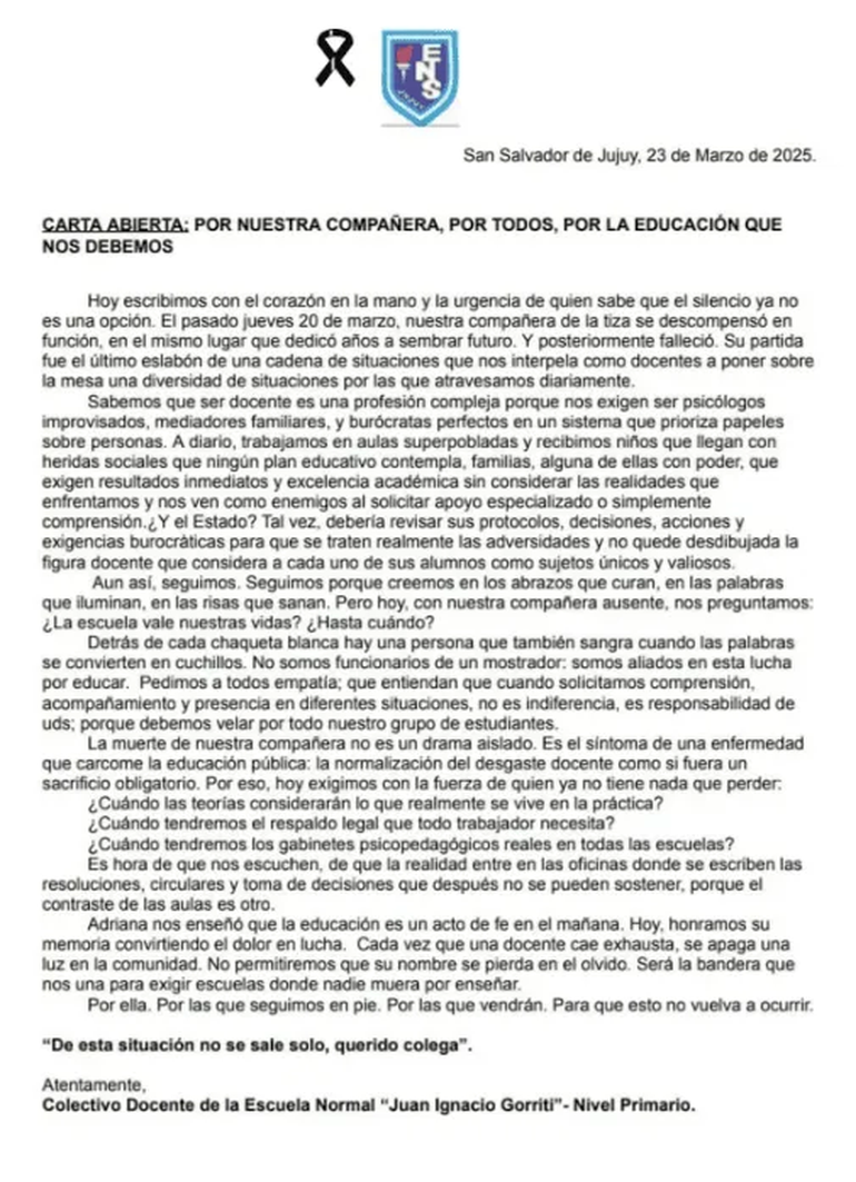 El trágico desenlace de la docente causó un gran impacto en la comunidad educativa y sus compañeros publicaron una carta abierta donde reflexionaron acerca de lo sucedido.