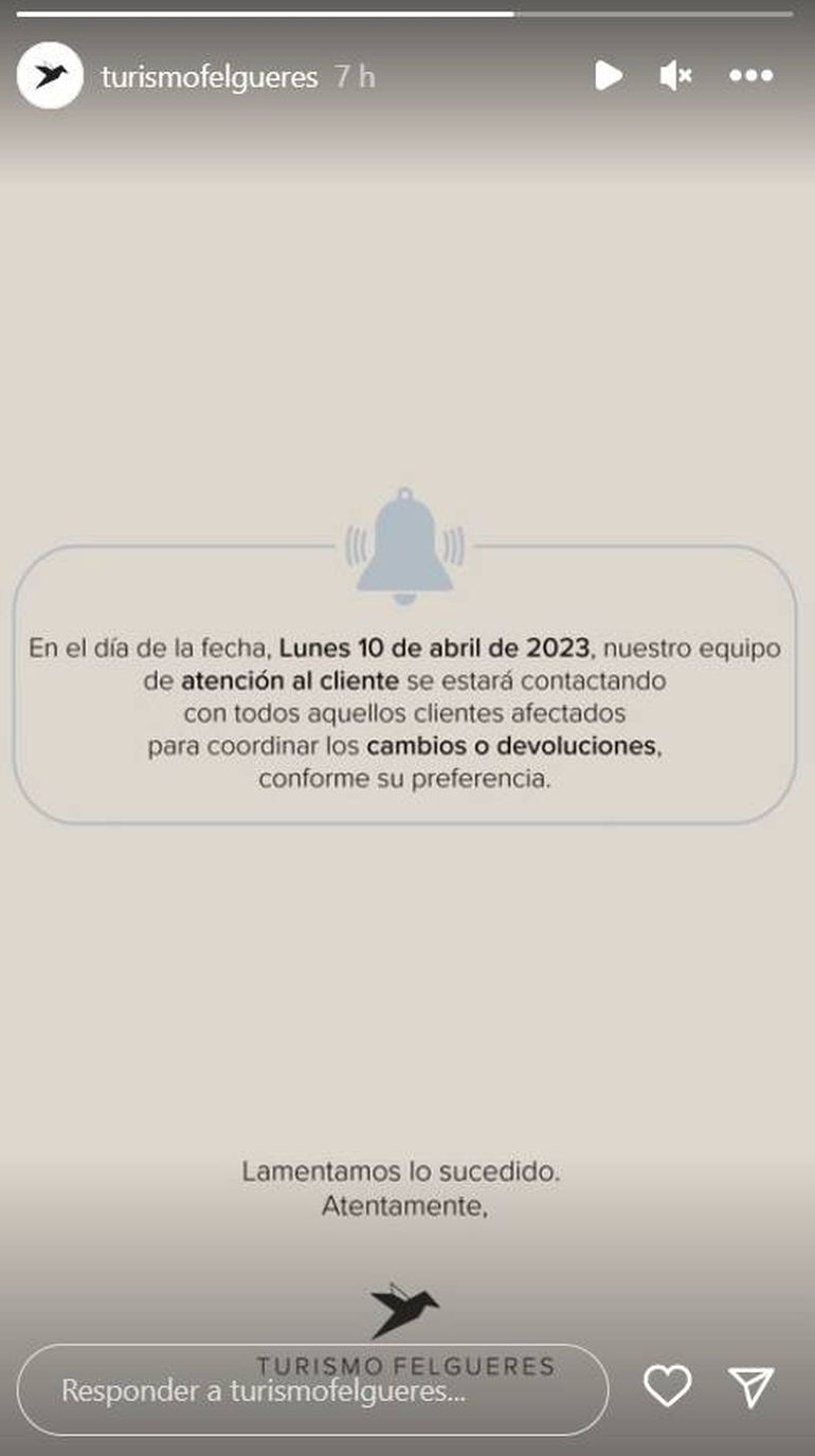 Por otra parte, en las redes sociales de la agencia comunicaron que: "En el día de la fecha, 10 de Abril de 2023, nuestro equipo de atención al cliente se estará contactando con aquellos clientes afectados para coordinar los cambios o devoluciones, conforme su preferencia".