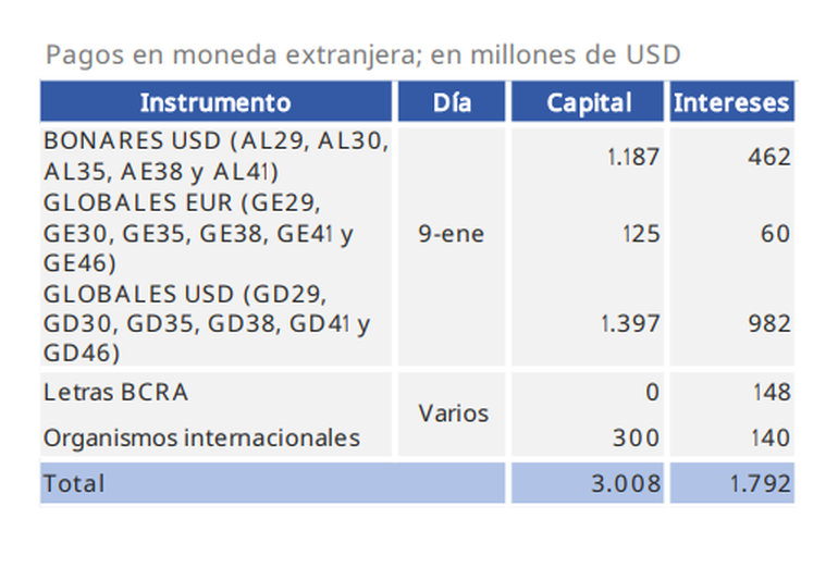 Por otro lado, hay letras del BCRA por u$s 148 millones de intereses y u$s 440 millones con organismos internacionales (excluido el FMI).
