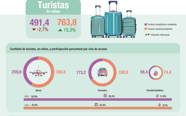 Por otro lado, el 71,8% del turismo emisivo se dirigió a los países limítrofes. Los principales destinos fueron Brasil, con 21,9%; y Chile, con 21,4%. El 47,0% de los turistas residentes salieron del país por la vía aérea; el 43,3%, por vía terrestre; y el 9,7%, por la vía fluvial/marítima.