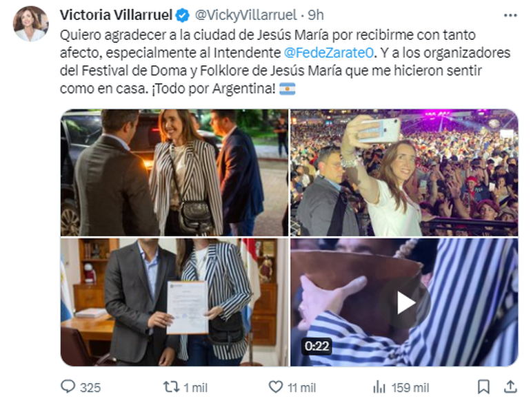 "Quiero agradecer a la ciudad de Jesús María por recibirme con tanto afecto, especialmente al Intendente @FedeZarate0. Y a los organizadores del Festival de Doma y Folklore de Jesús María que me hicieron sentir como en casa. ¡Todo por Argentina!", publicó en sus redes.
