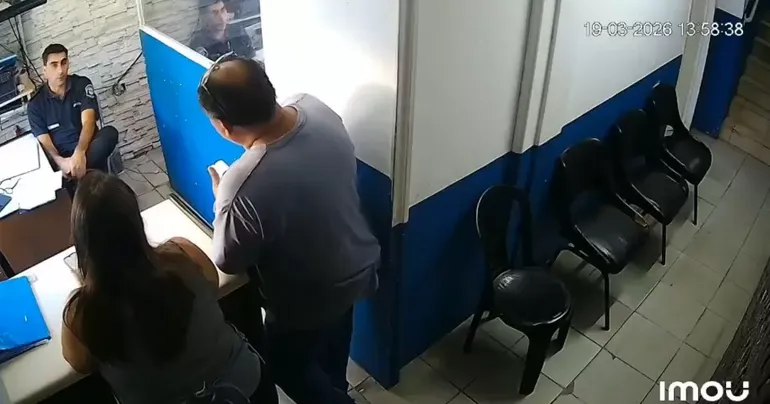 Todo el episodio quedó registrado por una cámara de seguridad. En las imágenes se observa cómo el efectivo sostiene su postura, mientras la mujer intenta explicar el problema. La tensión crece cuando ella anticipa que acudirá a otra dependencia para denunciar la falta de respuesta.