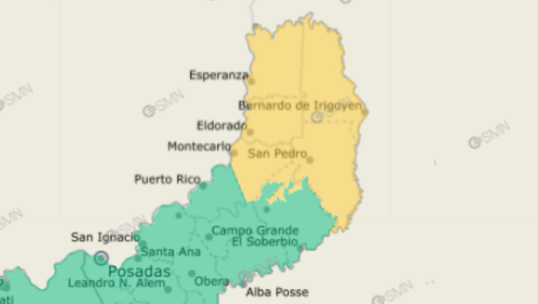 El primer aviso es por intensas tormentas y rige para el norte de Misiones, donde se prevén lluvias y tormentas, algunas localmente fuertes. Según el parte oficial, podría registrarse abundante caída de agua en cortos períodos, actividad eléctrica frecuente, ocasional caída de granizo y ráfagas de hasta 90 kilómetros por hora.