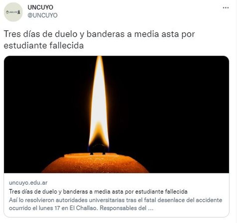Horas de mucho dolor se viven entre los alumnos de la Universidad Nacional de Cuyo (UNCuyo), quienes acaban de perder a una compañera tras el accidente que sufrieron todos al volcar una camioneta en la que viajaban en la provincia de Mendoza.