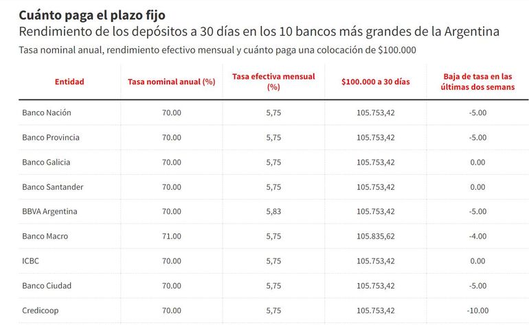 Ahora, entre los principales bancos argentinos la tasa promedio está prácticamente equilibrada en 70% nominal anual, es decir un rendimiento efectivo mensual del 5,75% que se traduce, para poner un ejemplo, en que un plazo fijo de $100.000 tras 30 días de colocación, arroja como resultado $105.753,42 de capital más intereses.